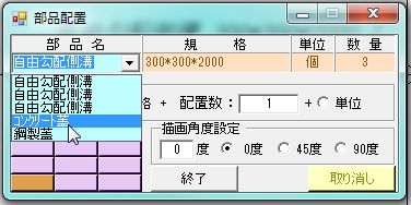 部品シートに部品名、規格、単位、数量を書き込み[部品配置]、[部品拾い込み]、[部品削除]を行います。