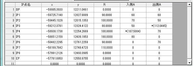 IP点名、x、y、R、そしてクロソイドの場合は入側A、出側A等を入力します。