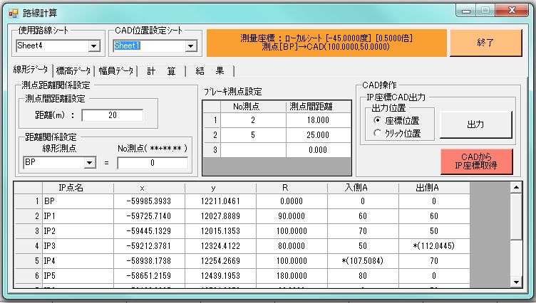 曲線は単曲線、対称、非対称、凸型、片側クロソイドの計算をします。また、任意測点計算、測点間の分割、ブレーキ測点に対応しています。