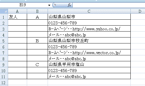 階層登録用にエクセルで作成したデータです。 メモ帳等で作成した、TAB区切りデータでもOKです。 データ領域を範囲選択し、右クリックからコピーし、クリップボードに登録します。 ホームページ、メールの右の”・・”は、 [ファイル]→[設定] で最下層で項目区切りをするにチェックが入っている場合の、区切り文字列です。 こうすると、項目名がそれぞれ”ホームページ”、”メール”になり、データにシートに書いたURL、メールアドレスが入ります。 |
